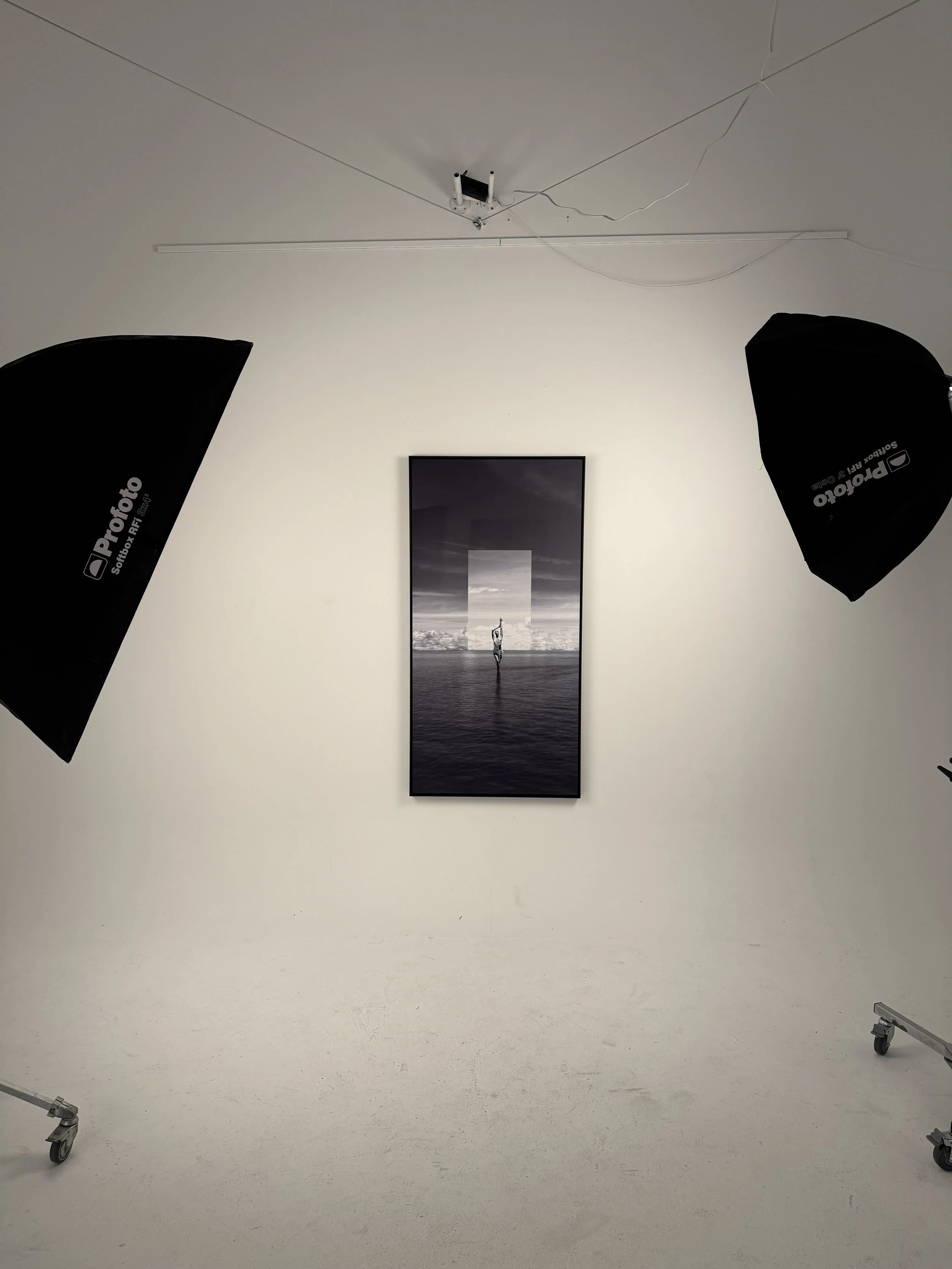 Photography studio with white walls, two black Profoto softboxes on either side, a framed black and white photo of a person standing on water in the center, and photography equipment in the corners.