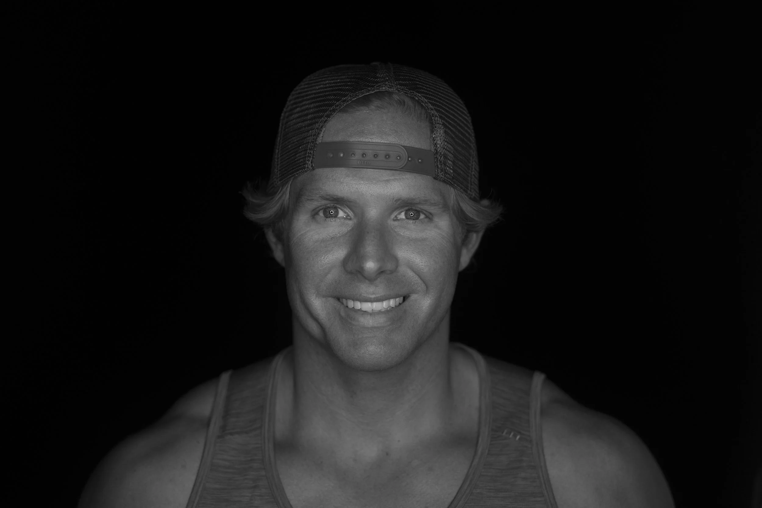 Black and white portrait of a young man wearing a backwards baseball cap and a sleeveless shirt, smiling at the camera against a black background.