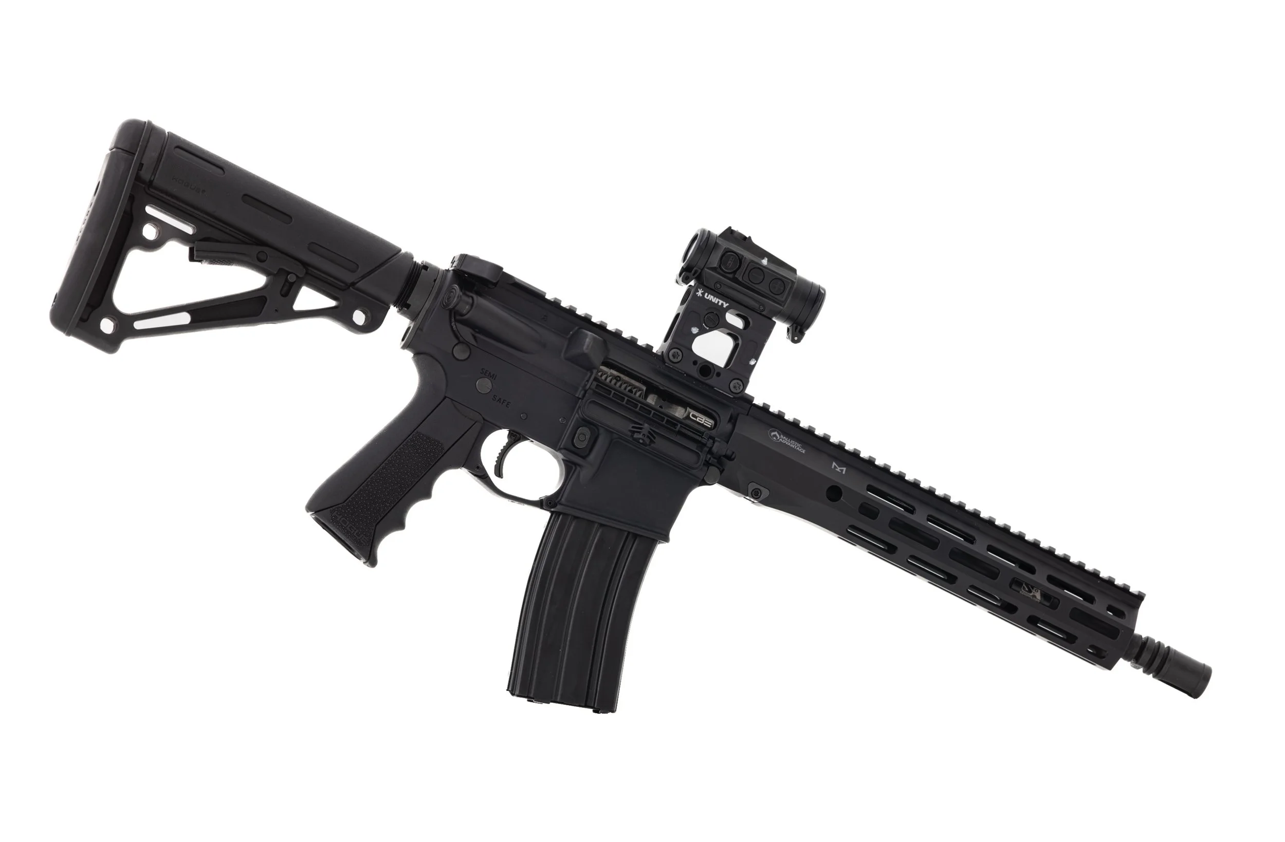 A black modern semi-automatic rifle with a scope, tactical handguard, and adjustable stock isolated on a white background.