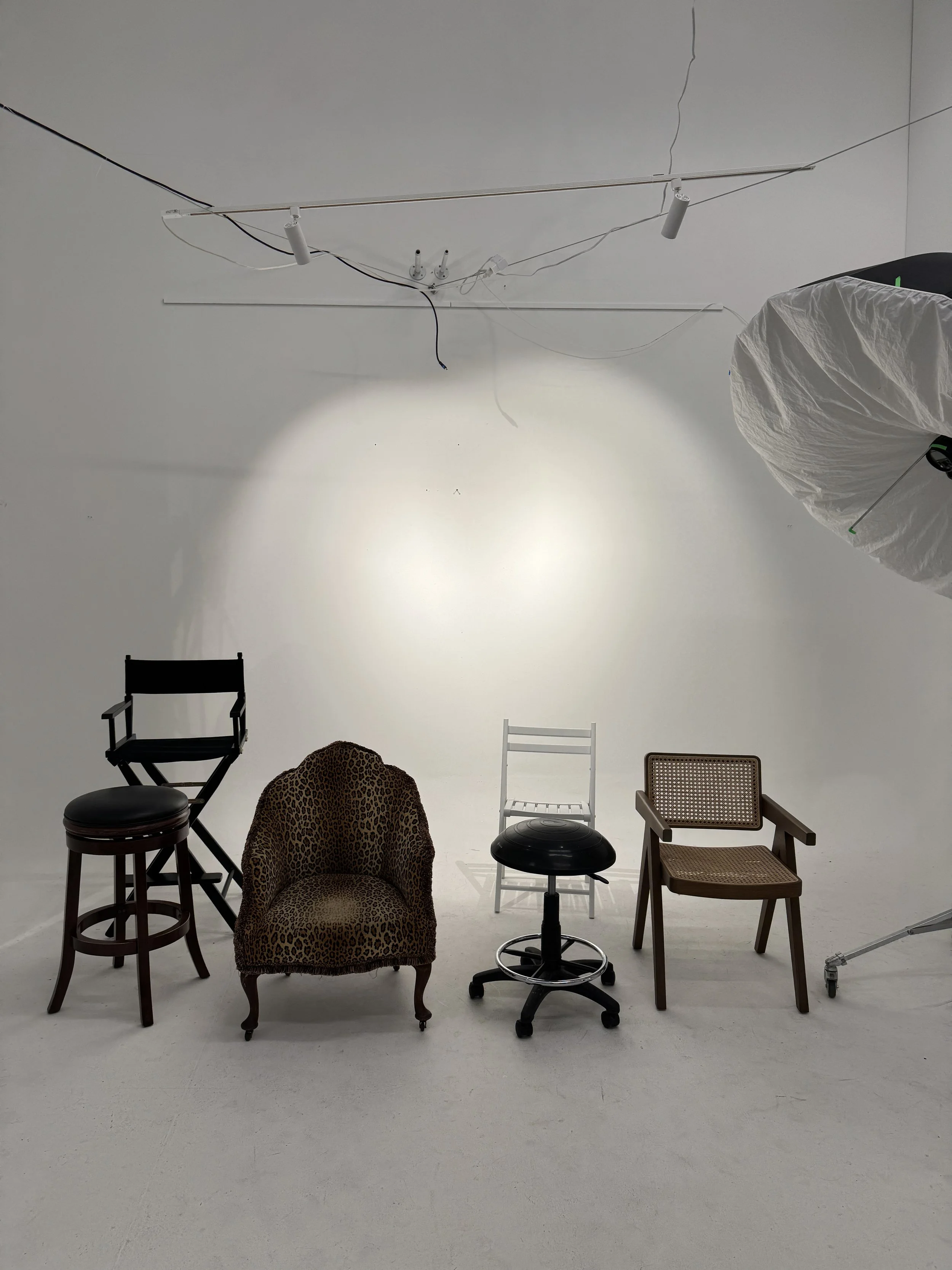 A row of five chairs with different designs and materials, placed on a white studio floor against a white wall, with studio equipment and lights overhead.