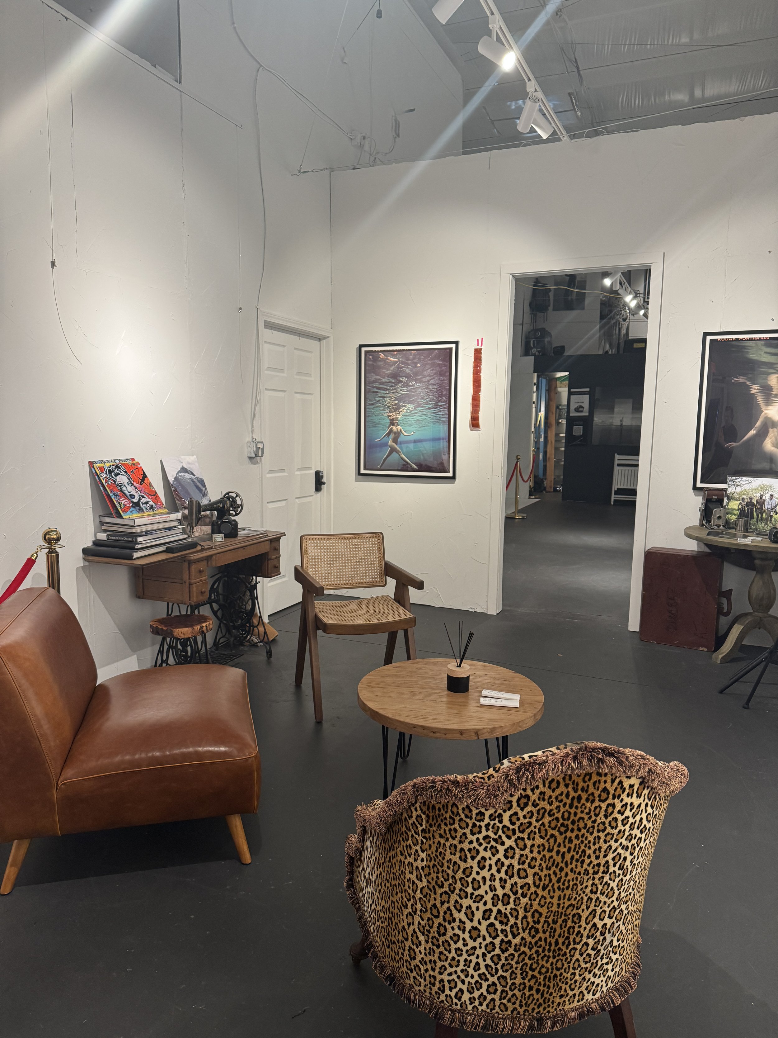 Interior of an art gallery or studio with seating, artwork on the walls, and various furniture pieces.